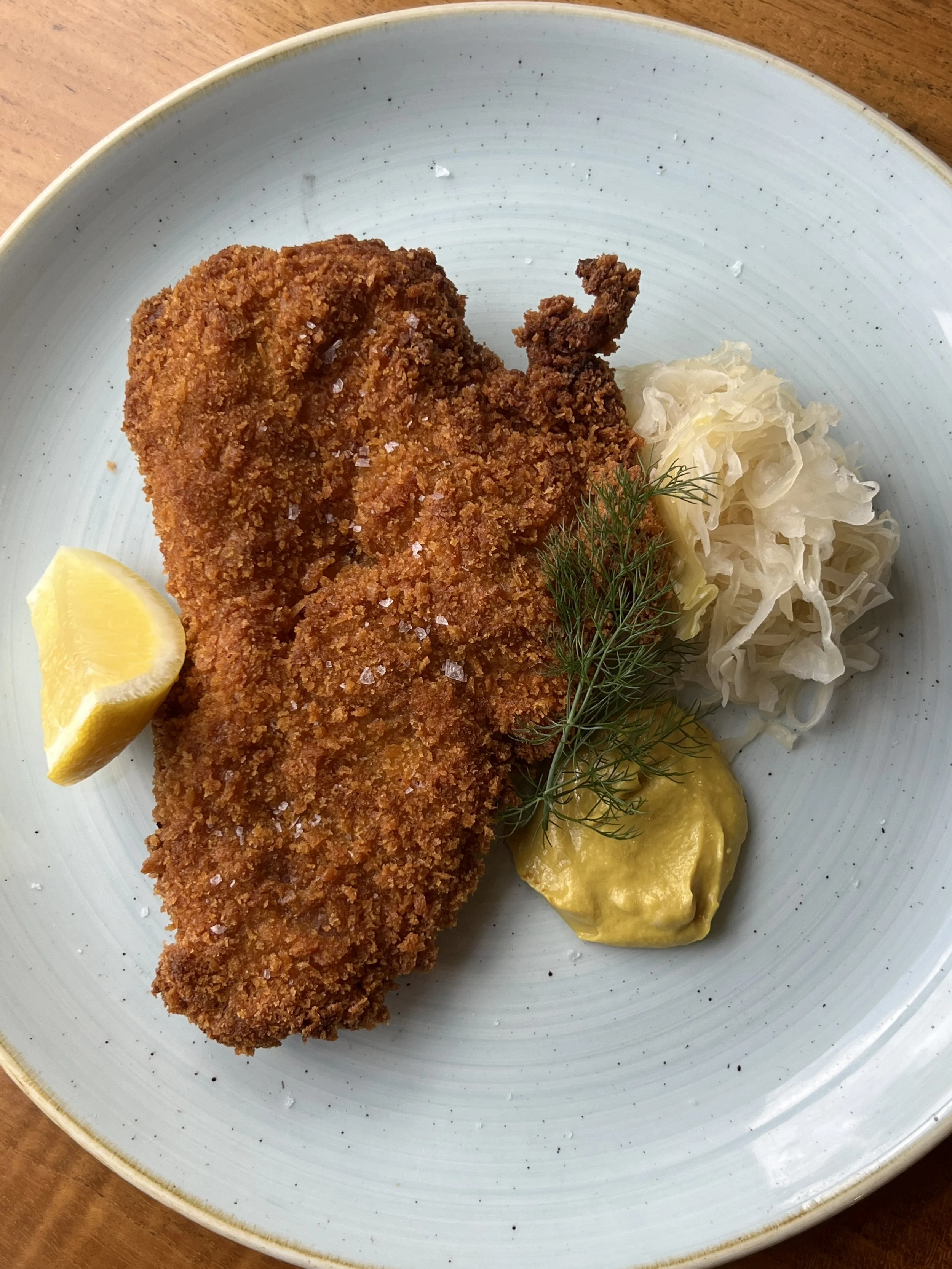 Pork Schnitzel – $24 Golden, crispy, and served with sauerkraut, mustard and lemon wedges.